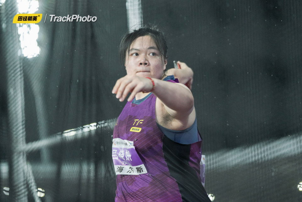 女子铁饼决赛时遭遇瓢泼大雨,给参赛选手带来极大挑战。河北运动员吕晓妍沉着应对,首投便以54米60的成绩跻身后三投;随后在第五投中更进一步,掷出56米96的个人最好成绩,最终摘得银牌。